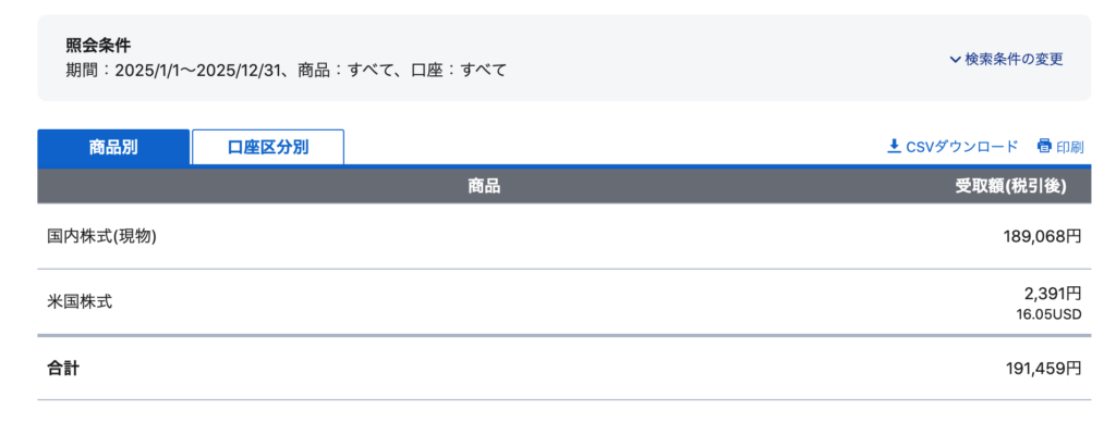 2025年に受け取った配当金の総額は191,459円でした。