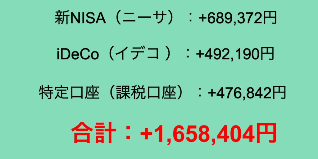 2025年8月の新NISA(ニーサ)、iDeCo(イデコ)、特定口座(課税口座)の含み益の総合計は+1,658,404円でした。先月より377,462円のプラスでした。