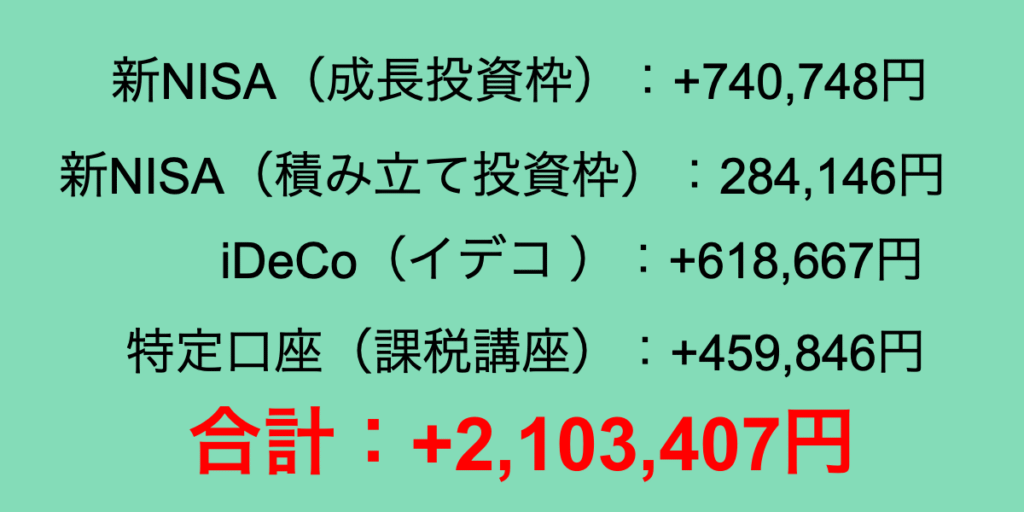 2025年10月の新NISA(ニーサ)、iDeCo(イデコ)、特定口座(課税口座)の含み益の総合計は+2,103,407円でした。先月より268,272円のプラスでした。