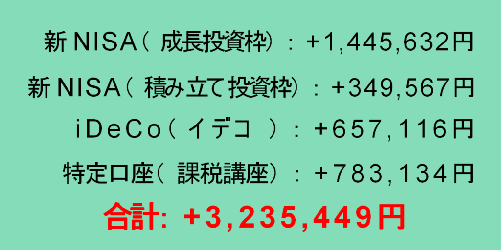 2026年1月の新NISA(ニーサ)、iDeCo(イデコ)、特定口座(課税口座)の含み益の総合計は+3,235,449円でした。先月より439,146円のプラスでした。