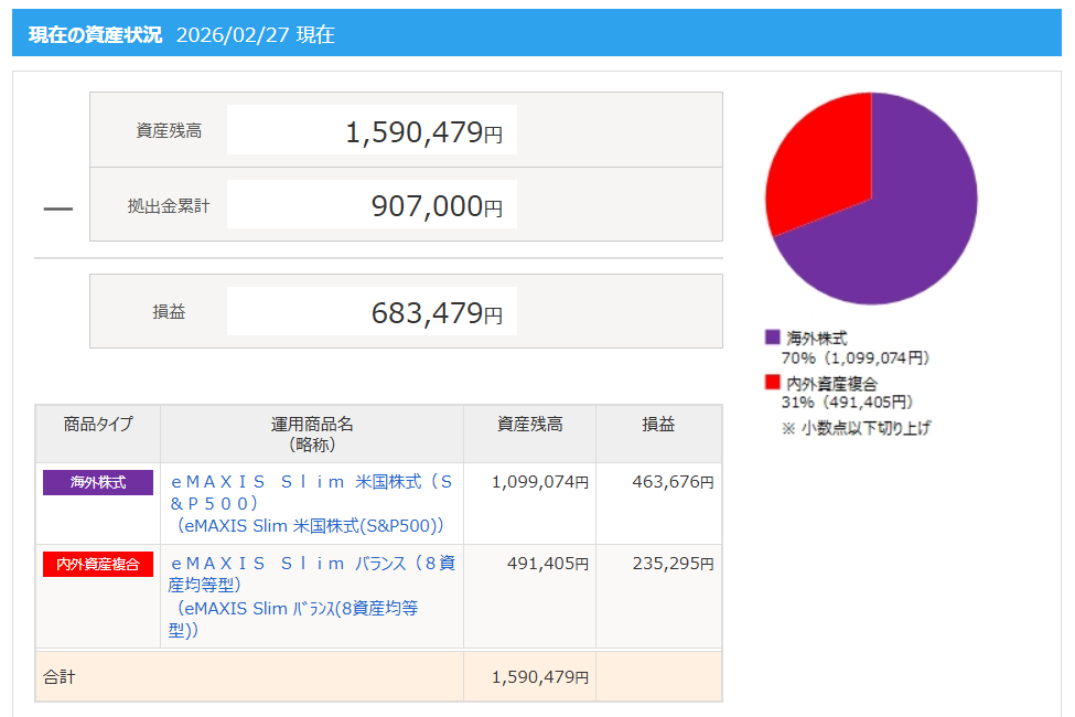 2026年2月の新NISAの運用成績は、成長投資枠と積み立て投資枠を合計して+2,591,890円でした。