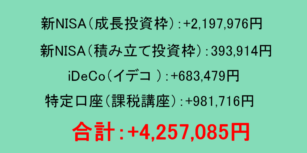 2026年2月の新NISA(ニーサ)、iDeCo(イデコ)、特定口座(課税口座)の含み益の総合計は+4,257,085円でした。先月より1,021,636円のプラスでした。